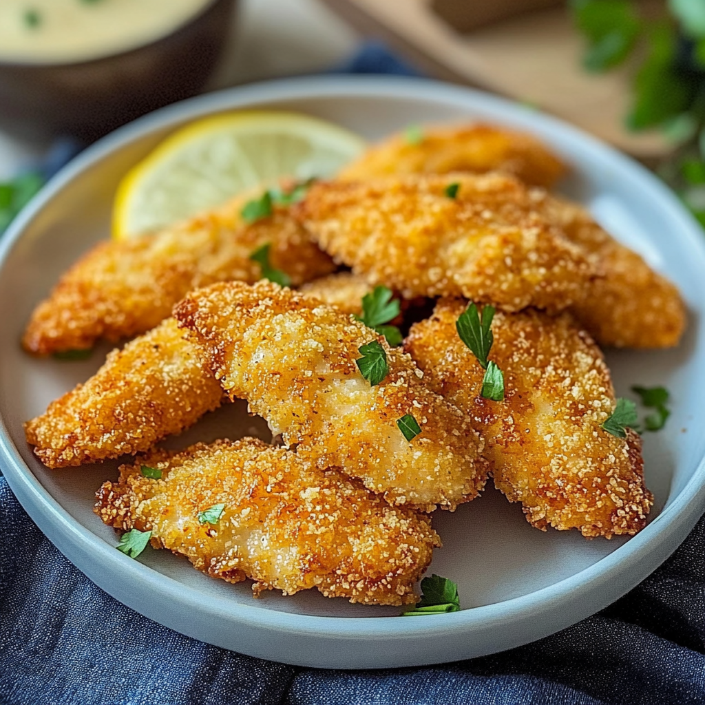 Dredge each chicken strip first in flour (shake off the excess), then dip it into the egg mixture, and finally coat it with panko breadcrumbs. Make sure each strip is fully covered for maximum crunch!