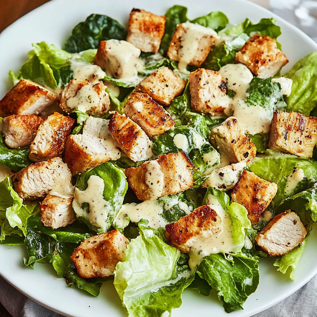 Sear the chicken first until golden brown, then cook your pasta while preparing the creamy dressing. Toss in fresh romaine and sprinkle with croutons just before serving for that perfect crunch.