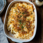 French Onion Funeral Potatoes are a comforting casserole dish made from hash browns, creamy soup, sour cream, and topped with crispy fried onions. This dish is often served at gatherings and potlucks, offering a deliciously cheesy flavor that pairs well with various main courses. It’s a crowd-pleaser that combines the richness of French onion dip with the heartiness of potato casserole. Perfect for any occasion, these potatoes bring warmth and comfort to the table.