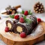 A Mini Buche de Noël is a charming French dessert shaped like a log, traditionally served during the Christmas season. It features a light sponge cake rolled around creamy filling and frosted with chocolate ganache or buttercream to resemble tree bark.
