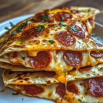 Pepperoni pizza quesadillas combine the delicious flavors of traditional pepperoni pizza with the convenience of a quesadilla. They consist of tortillas filled with cheese, pepperoni slices, and your favorite pizza toppings. Grilled until crispy, these quesadillas deliver a gooey and savory experience that appeals to both kids and adults. They make for a perfect snack or quick meal option, offering a delightful twist on classic pizza.