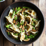 Store leftovers in an airtight container in the fridge for up to three days. To reheat, gently warm in a skillet over low heat to maintain the dumplings’ texture and flavor without turning them into mushy blobs.