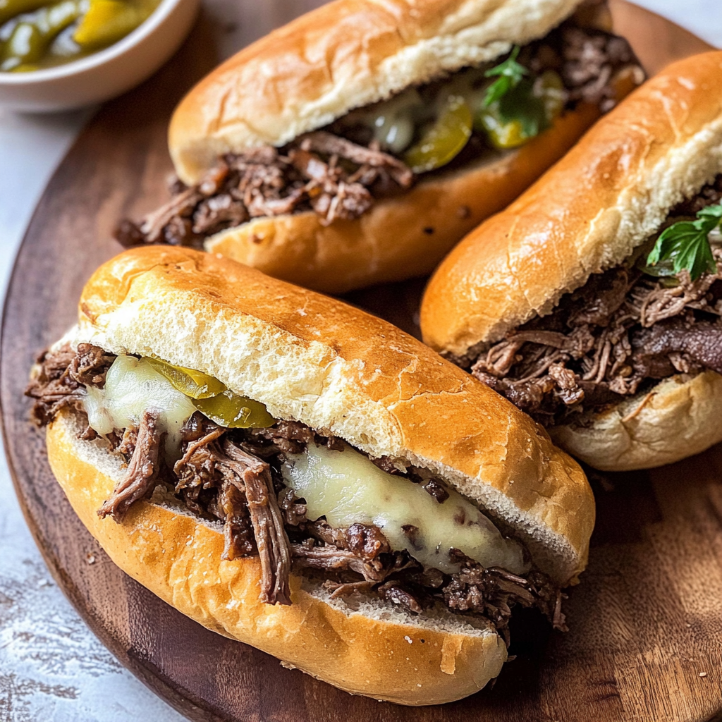 Assemble Your Sandwiches!: Grab your sub rolls and pile on generous portions of shredded beef topped with melted provolone cheese. The final assembly is where all your efforts pay off!